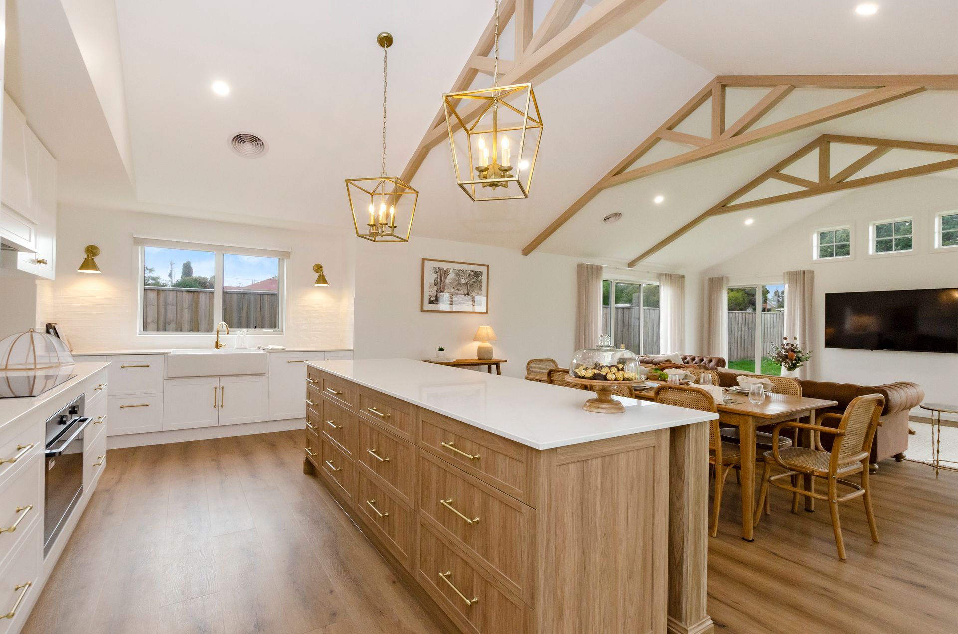 At the heart of the home is a stunning open-plan living, kitchen, and dining, featuring cathedral ceilings decorated with exposed timber trusses to add character and charm.